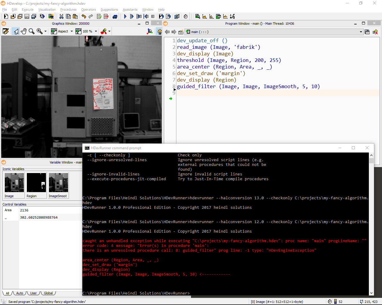 Check Mode can be used for automatic testing for syntactically visible errors. This screenshot shows that the program is correct when used with HALCON 13, but has an error when used with HALCON 12. The error context is shown in the console window. The operator guided_filter is first introduced in HALCON 13 and is thus not available in HALCON 12.