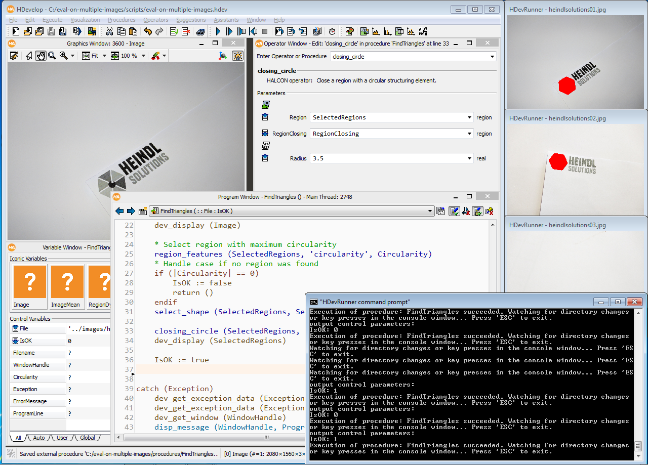 Whenever a procedure is saved, it can automatically be executed with HDevRunner with e.g. multiple test images or under different HALCON version with the watch mode. Or maybe you want to check only without actually executing the script.